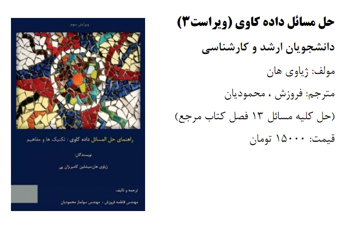 کتاب راهنمای حل مسائل داده کاوی تکنیکها و مفاهیم (منطبق بر ویراست سوم) کتاب مرجع هان می باشد.در این کتاب که شامل13 فصل می باشد کلیه مسائل انتهای فصول کتاب مرجع بصورت روان و ساده حل شده است.همچنین شامل خلاصه هر فصل ونمونه سوالات امتحانی نیز می باشد.
