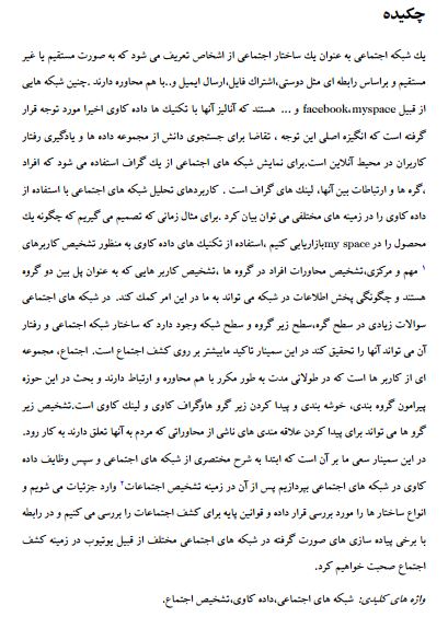 یک شبکه اجتماعی به عنوان یک ساختار اجتماعی از اشخاص تعریف می شود که به صورت مستقیم یا غیر مستقیم و براساس رابطه ای مثل دوستی،اشتراک فایل،ارسال ایمیل و..با هم محاوره دارند .چنین شبکه هایی از قبیل facebook,myspace و … هستند که آنالیز آنها با تکنیک هاداده کاوی اخیرا مورد توجه قرار گرفته است که انگیزه اصلی این توجه ، تقاضا برای جستجوی دانش از مجموعه داده ها و یادگیری رفتار کاربران در محیط آنلاین است.برای نمایش شبکه های اجتماعی از یک گراف استفاده می شود که افراد ،گره ها و ارتباطات بین آنها، لینک های گراف است .کاربردهای داده کاوی در شبکه های اجتماعی را در زمینه های مختلفی می توان بیان کرد .برای مثال زمانی که تصمیم می گیریم که چگونه یک محصول را در my spaceبازاریابی کنیم ،استفاده از تکنیک های داده کاوی در شبکه های اجتماعی به منظور تشخیص کاربرهای actor مهم و مرکزی،تشخیص محاورات افراد در گروه ها ،تشخیص کاربر هایی که به عنوان پل بین دو گروه هستند و چگونگی پخش اطلاعات در شبکه می تواند به ما در این امر کمک کند.در شبکه های اجتماعی سوالات زیادی در سطح گره،سطح زیر گروه و سطح شبکه وجود دارد که داده کاوی در شبکه های اجتماعی می تواند آنها را تحقیق کند در این سمینار تاکید مابیشتر بر روی کشف اجتماع است.اجتماع، مجموعه ای از کاربر ها است که در طولانی مدت به طور مکرر با هم محاوره و ارتباط دارند و بحث در این حوزه پیرامون گروه بندی, خوشه بندی و پیدا کردن زیر گرو هاوگراف کاوی و لینک کاوی است.تشخیص زیر گرو ها می تواند برای پیدا کردن علاقه مندی های ناشی از محاوراتی که مردم به آنها تعلق دارند به کار رود.در این سمینار سعی ما بر آن است که ابتدا به شرح مختصری از شبکه های اجتماعی و سپس وظایف داده کاوی در شبکه های اجتماعی بپردازیم پس از آن در زمینه تشخیص اجتماعاتcommunity detection وارد جزئیات می شویم و انواع ساختار ها را مورد بررسی قرار داده و قوانین پایه برای کشف اجتماعات را بررسی می کنیم و در رابطه با برخی پیاده سازی های صورت گرفته در شبکه های اجتماعی مختلف از قبیل یوتیوب در زمینه کشف اجتماع صحبت خواهیم کرد. این گزارش اطلاعات خوبی را در زمینه داده کاوی در شبکه های اجتماعی در اختیار شما قرار خواهد داد.