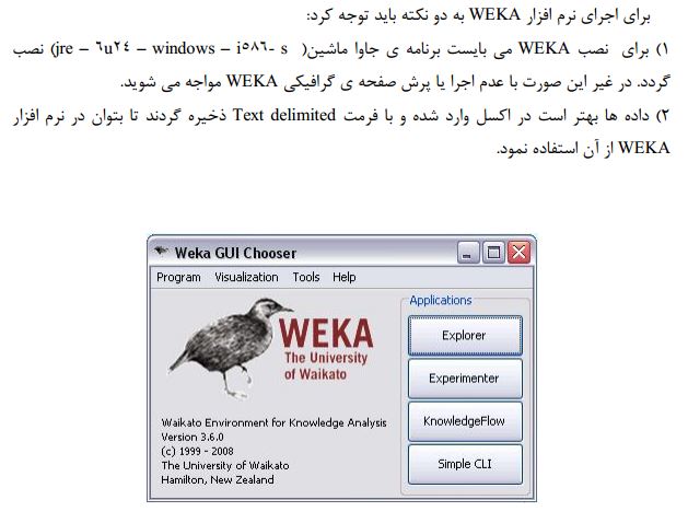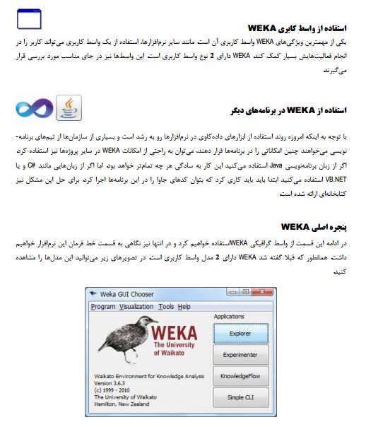 این مستند به طور کامل از صفر تا صد به توضیح کامل نرم افزار Weka می پردازد که میتواند مرجع بسیار مناسبی برای افرادی باشد که میخواهند به طور علمی و عملی از آن استفاده نمایند. به این صورت که ابتدا به معرفی و شرح امکانات آن پرداخته شده و در ادامه به توضیح تمامی منوها و امکانات آن با استفاده از مثال های عملی پرداخته میشود.